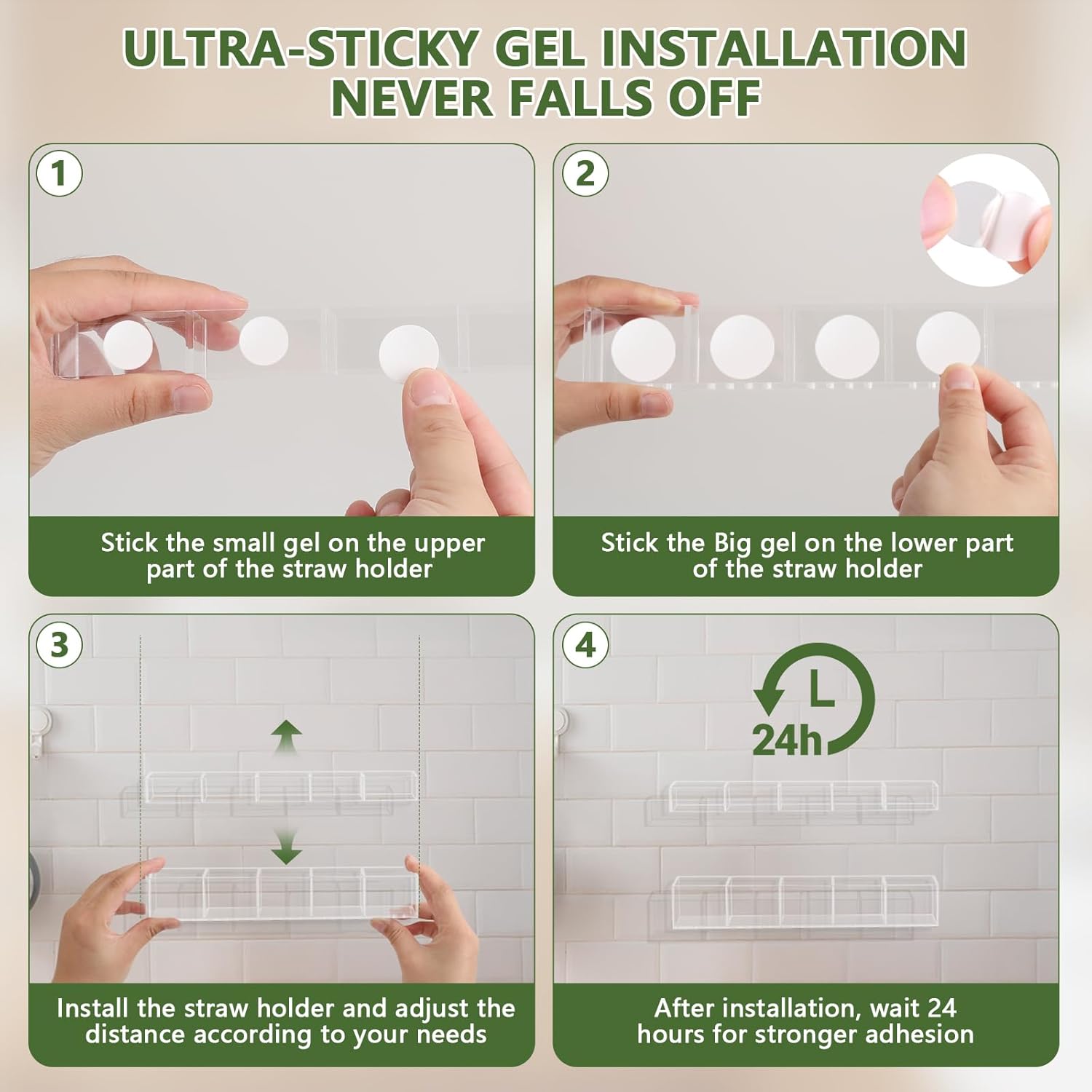 • Ultra-Sticky & Secure Installation – Extra-strong nano gel pads keep the organizer firmly in place for a stable, reliable hold without falling. Tip: For best results, first use your own regular tape to temporarily secure the two acrylic modules inside the cabinet, ensuring the spacing fits your straws and does not affect the door’s opening or closing. Once confirmed, attach with the included nano gel pads.