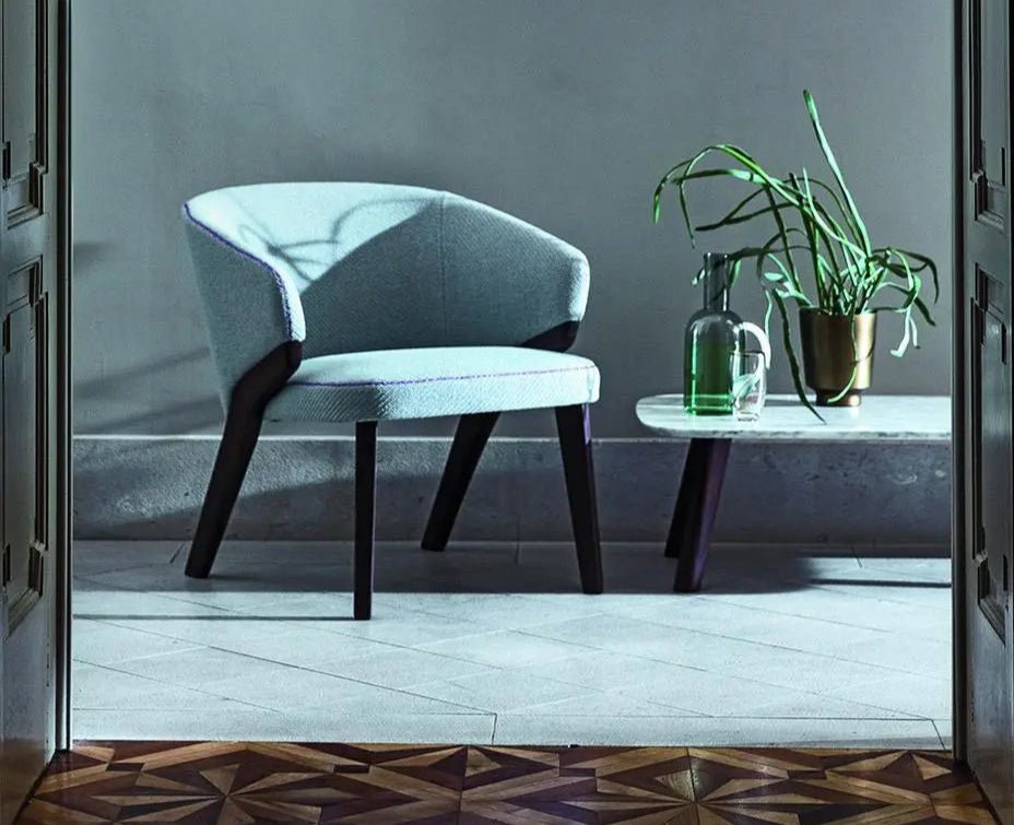 The generously padded seat, backrest, and armrests offer unparalleled comfort, while the upholstery—available in a wide array of luxurious fabrics and leathers—allows for a personalized touch. The armchair’s compact proportions make it ideal for creating intimate seating arrangements in living rooms, lounges, or hospitality settings. With its refined aesthetics and ergonomic design, the Nora Armchair is a perfect combination of style, comfort, and functionality.