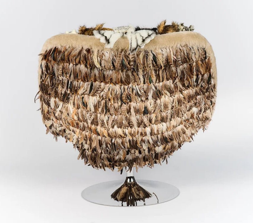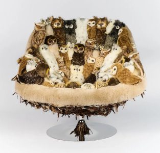 Each chair is meticulously handmade, ensuring that no two are exactly alike. The chair’s structure combines various materials, including natural sheep wool, polyester plushes, textile fabrics, wood, and metal, to create a luxurious and durable seating experience. The plush owl figures are carefully crafted to add texture and visual interest, making the chair a standout piece in any interior.