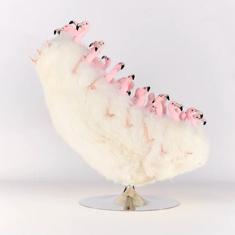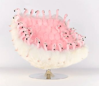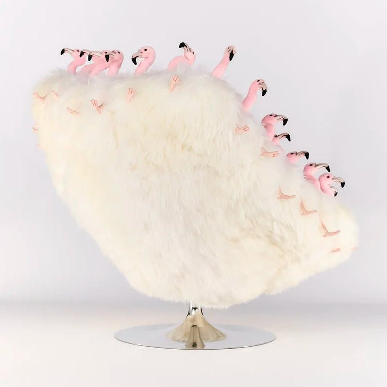 Each chair is meticulously handmade, ensuring that no two are exactly alike. The chair’s structure combines various materials, including polyester plushes, metal, wood, textile fabrics, and New Zealand sheepskin, to create a luxurious and durable seating experience. The plush flamingo figures are carefully crafted to add texture and visual interest, making the chair a standout piece in any interior.