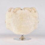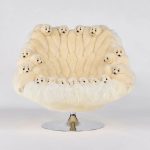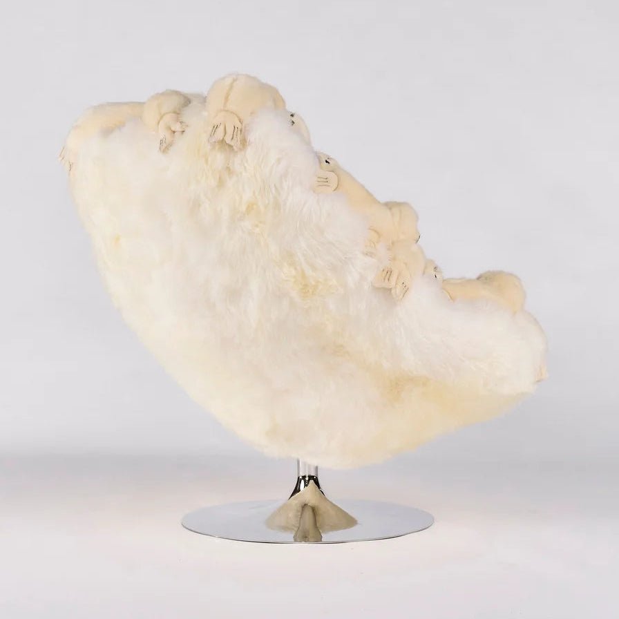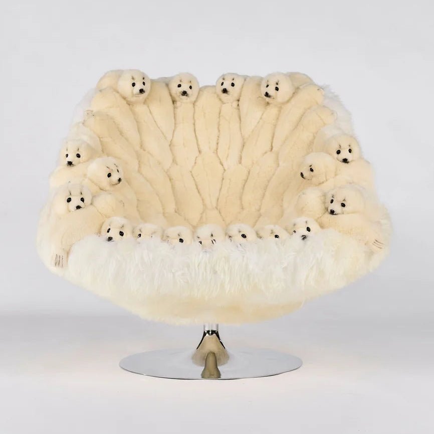 Materials: Handmade lounge chair adorned with various stuffed harp seals. Metal disk base available in various finishes. Handmade polyester plushes, metal, wood, textile fabrics, cowhide, and sheepskin, handmade in Belgium. Swivel.